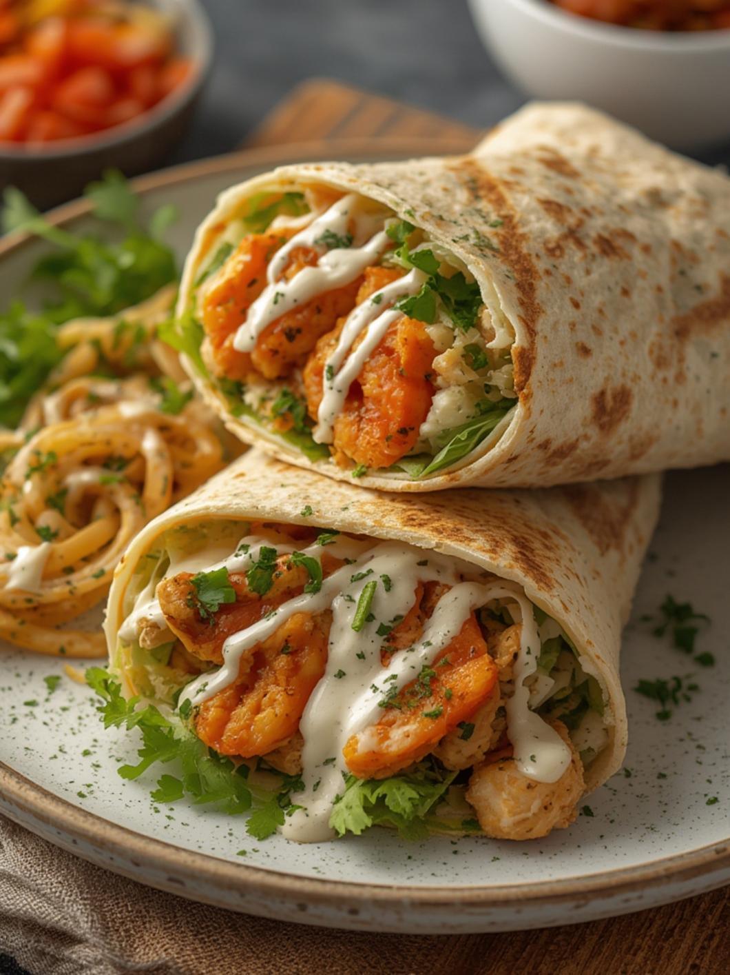6. Serve: Garnish your wraps with fresh parsley and serve them warm with leftover shawarma sauce on the side for dipping.