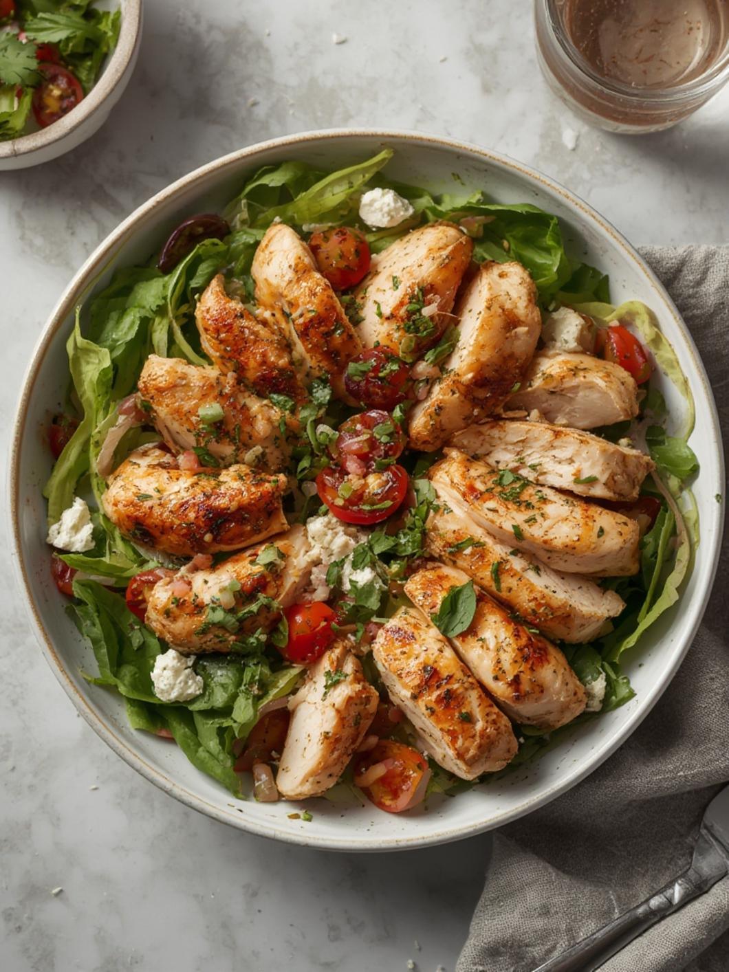 – Once the chicken and grains are ready, layer the quinoa or couscous in bowls. Top with cooked chicken, spinach, tomatoes, cucumber, red onion, and crumbled feta.